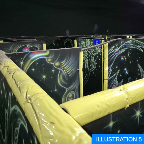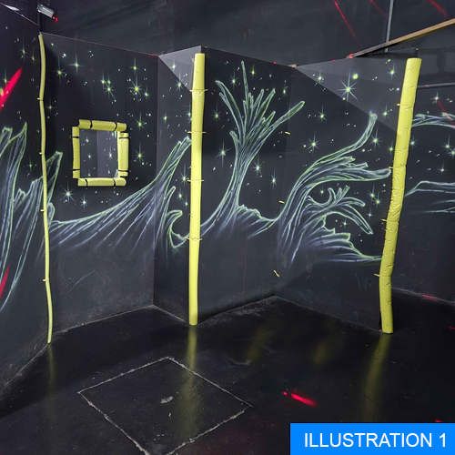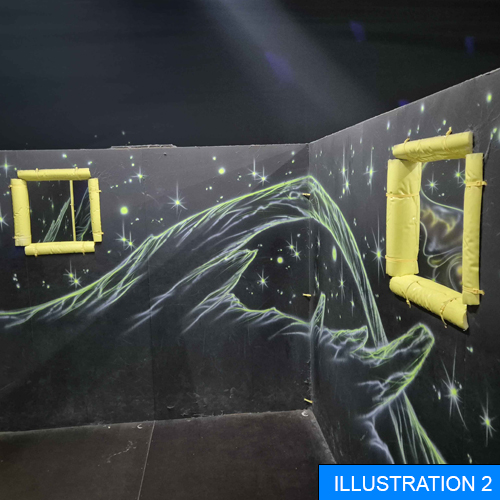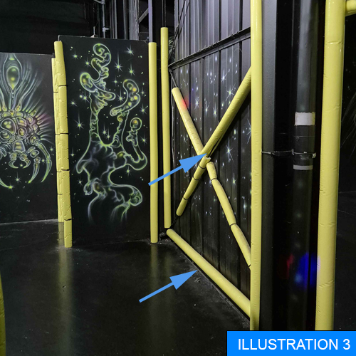 - Illustration 1 : les angles des parois et les contours de fenêtres sont protégées par des boudins jaunes pouvant parfoir stopper certains angles de tirs