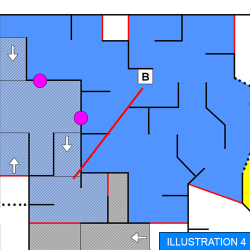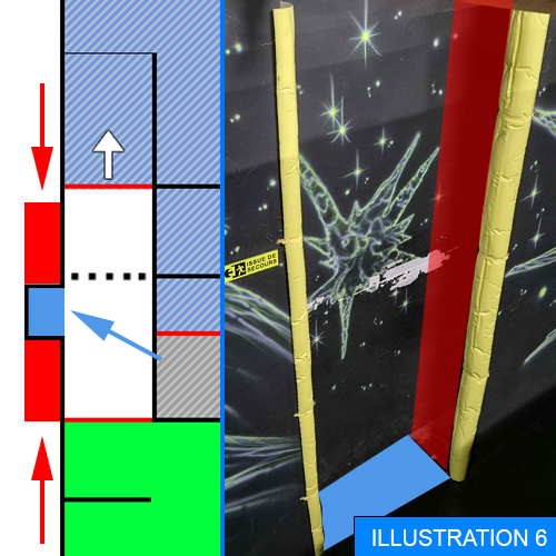 - Illustration 4 et 5 : base bleue : depuis la passerelle, les tirs entre joueurs sont aurorisées sauf sur la base. Un angle de tir physiquement possible sera matériellement bloqué le jour du tournoi
